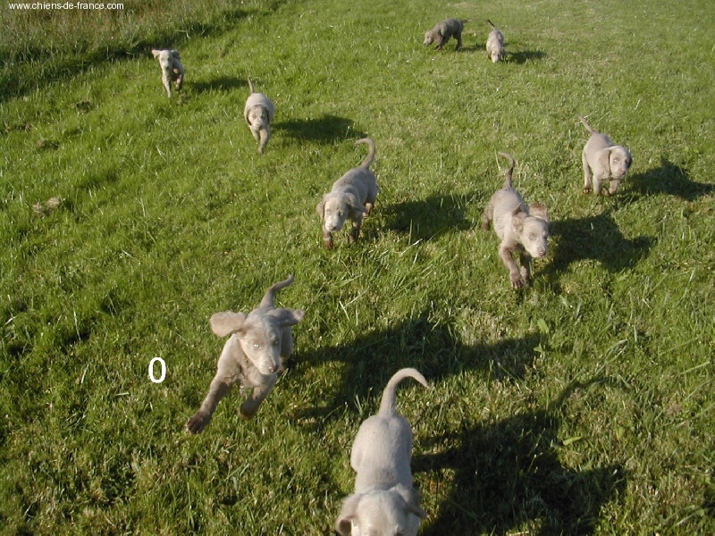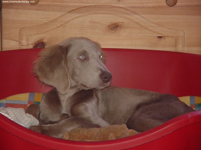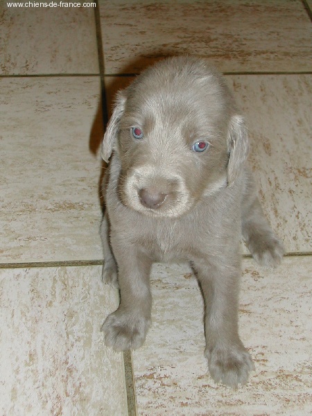 Chiot gris argent clair (lumineux). Aucune tache blanche. Vermifugé le 19.10.2006. Examiné par le DR JP ROSSATO le 24.10.2006 sans aucunes malformations ni vices cachés; les deux testicules en ordre. Vacciné en ordre. Un chiot tranquille, silencieux, très sûr de lui qui s'impose gentiment. Le 12.11.06 Arko est élu Vice-Champion du Monde en Classe Travail à Poznan en Pologne. et la mère VICKY vient de remporter son CHCS titre de Championne de France. Il est parti chez la famille Brousseau Dépt (37), chasseur.