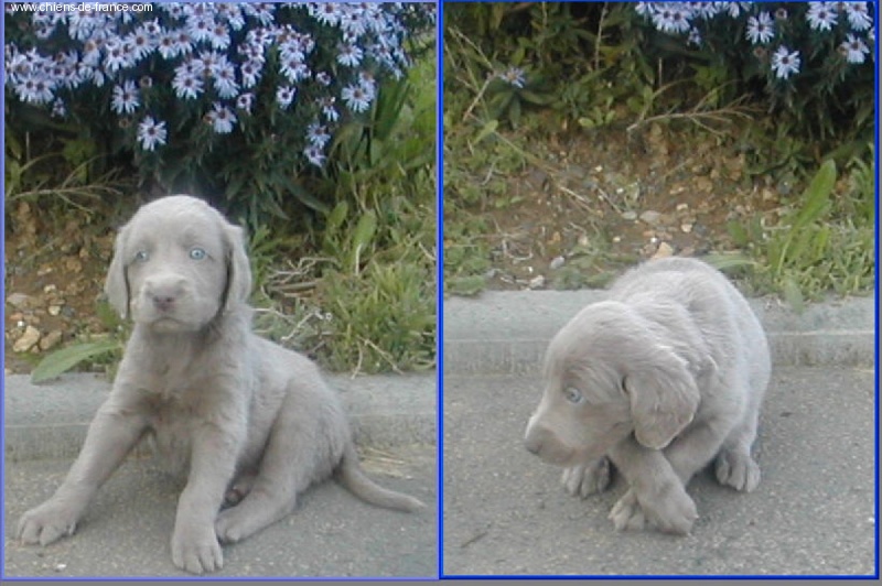 Chiot gris argent clair (lumineux). Aucune tache blanche. Vermifugé le 19.10.2006. Examiné par le DR JP ROSSATO le 24.10.2006 sans aucunes malformations ni vices cachés; les deux testicules en ordre. Vacciné en ordre. Un chiot très très indépendant, toujours prêt à découvrir son environnement. Le 12.11.06 Arko est élu Vice-Champion du Monde en Classe Travail à Poznan en Pologne et la mère VICKY vient de remporter son CHCS titre de Championne de FRANCE. Propriétaire: Pascal ROUDAUT Dépt (95), chasseur.